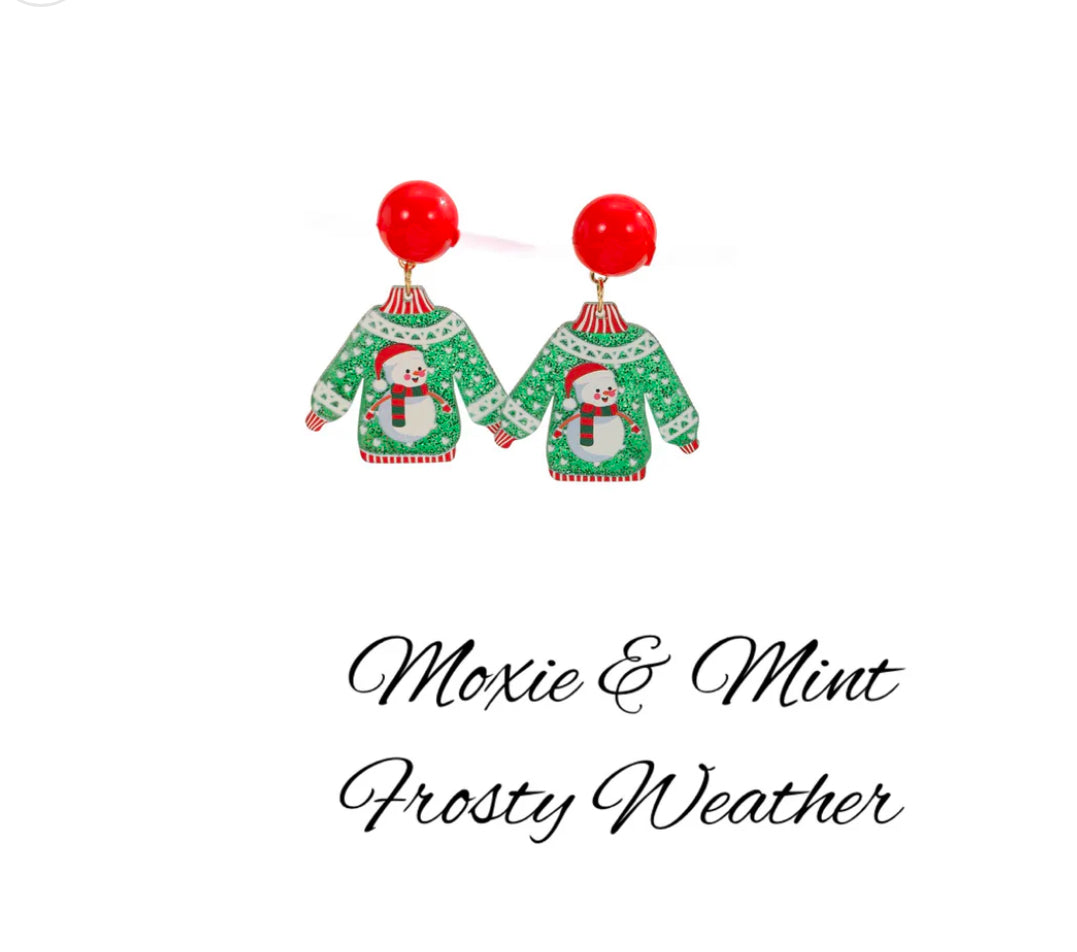 Stay festive and stylish in the cold with our E461-5 Frosty Weather earrings. These post back acrylic earrings feature a charming sweater and Frosty the Snowman design. Perfect for adding a touch of holiday cheer to any outfit.