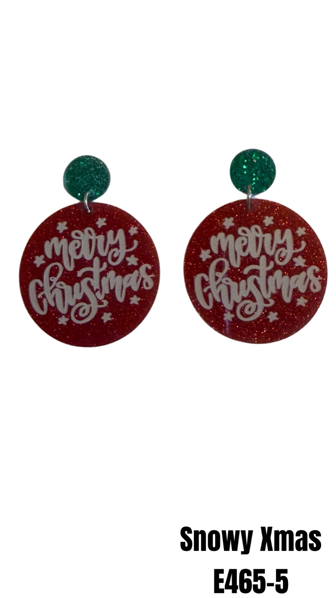 These E465-5 Snowy Xmas earrings feature a festive design with an acrylic green circle and red sparkly circle, perfect for adding some holiday cheer to any outfit. The post-back style ensures secure and comfortable wear. Get into the holiday spirit with these merry Christmas earrings.