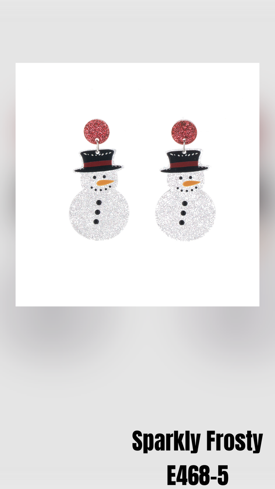 Enhance your holiday look with E468-5 Sparkly Frosty earrings. Crafted with acrylic red circles, these earrings feature drop snowman designs that add a touch of sparkle to any outfit. The post back ensures a secure fit, making them perfect for any festive occasion.