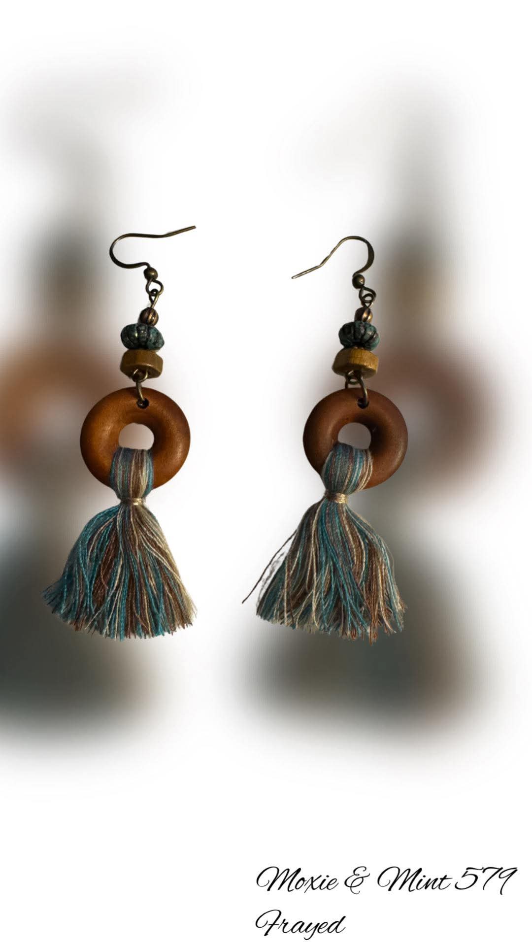 Expertly crafted, the E640-5 Frayed bracelet boasts a beautiful combination of bronze fish hook, tarnished turquoise beads, and a wooden circle accented with a vibrant multicolored tassel. Perfect for any occasion, this piece adds a touch of bohemian charm to your outfit.