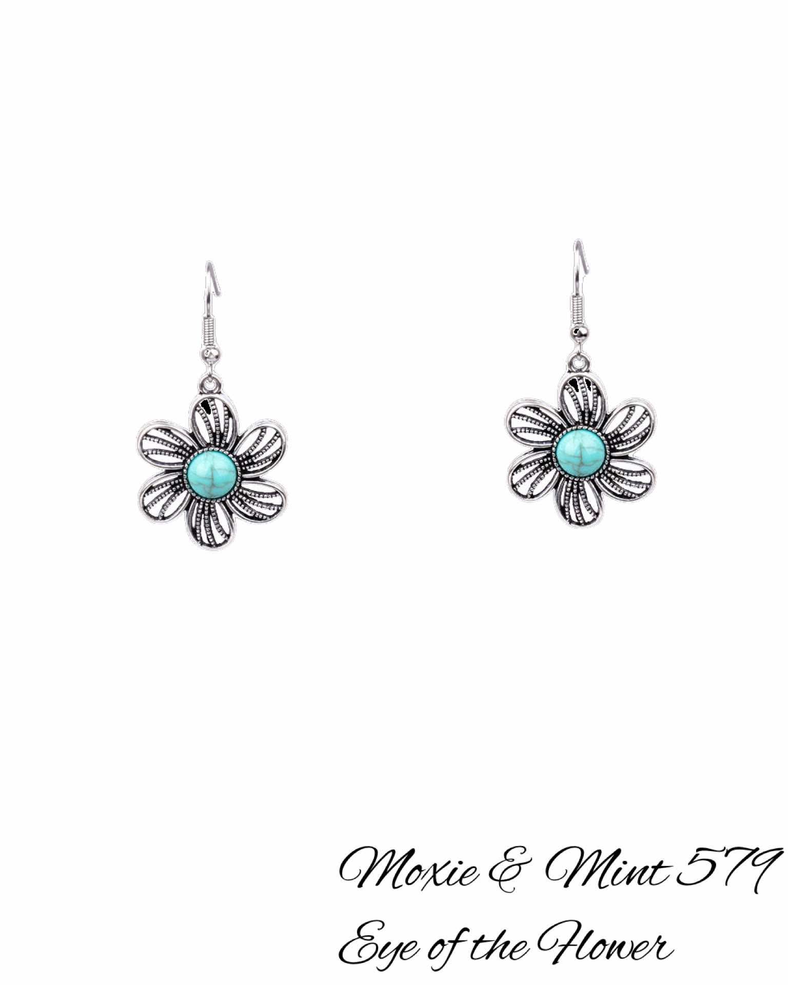 Expertly crafted and uniquely designed, the E650-5 Eye of the Flower earring boasts a striking silver flower with a fishhook backing, adorned with a mesmerizing crackled turquoise center. Elevate any outfit with this elegant accessory that seamlessly combines style and quality.