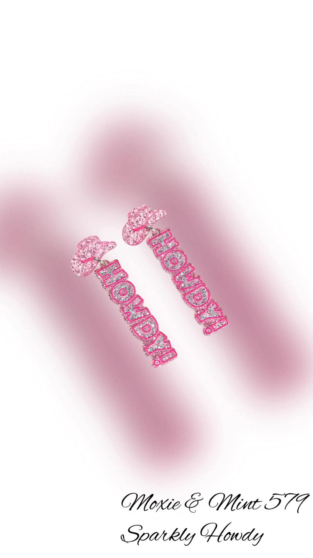 Introducing the E652-5 Sparkly Howdy earrings, the perfect accessory for those who want to add a touch of sparkle to their western-inspired look. These post back earrings feature a shimmering pink and silver acrylic cowboy hat, adorned with the bold letters "Howdy". A must-have for any cowgirl or cowboy looking to make a stylish statement.