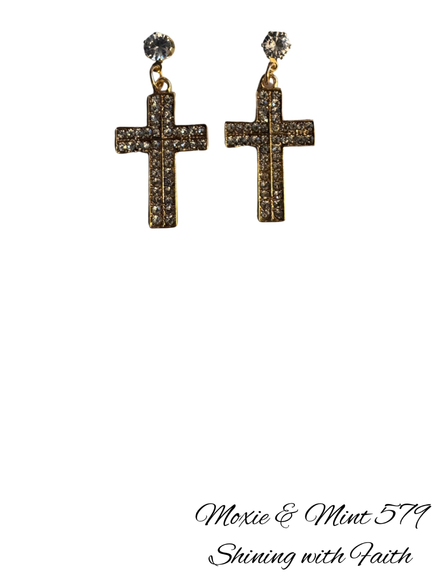 Upgrade your accessory game with our E680-6 Shining with Faith earrings. Crafted with gold post back and dangling cross embellishments, these earrings are perfect for showcasing your faith while adding a touch of sparkle with rhinestones. Elevate any outfit with these elegant and versatile earrings.