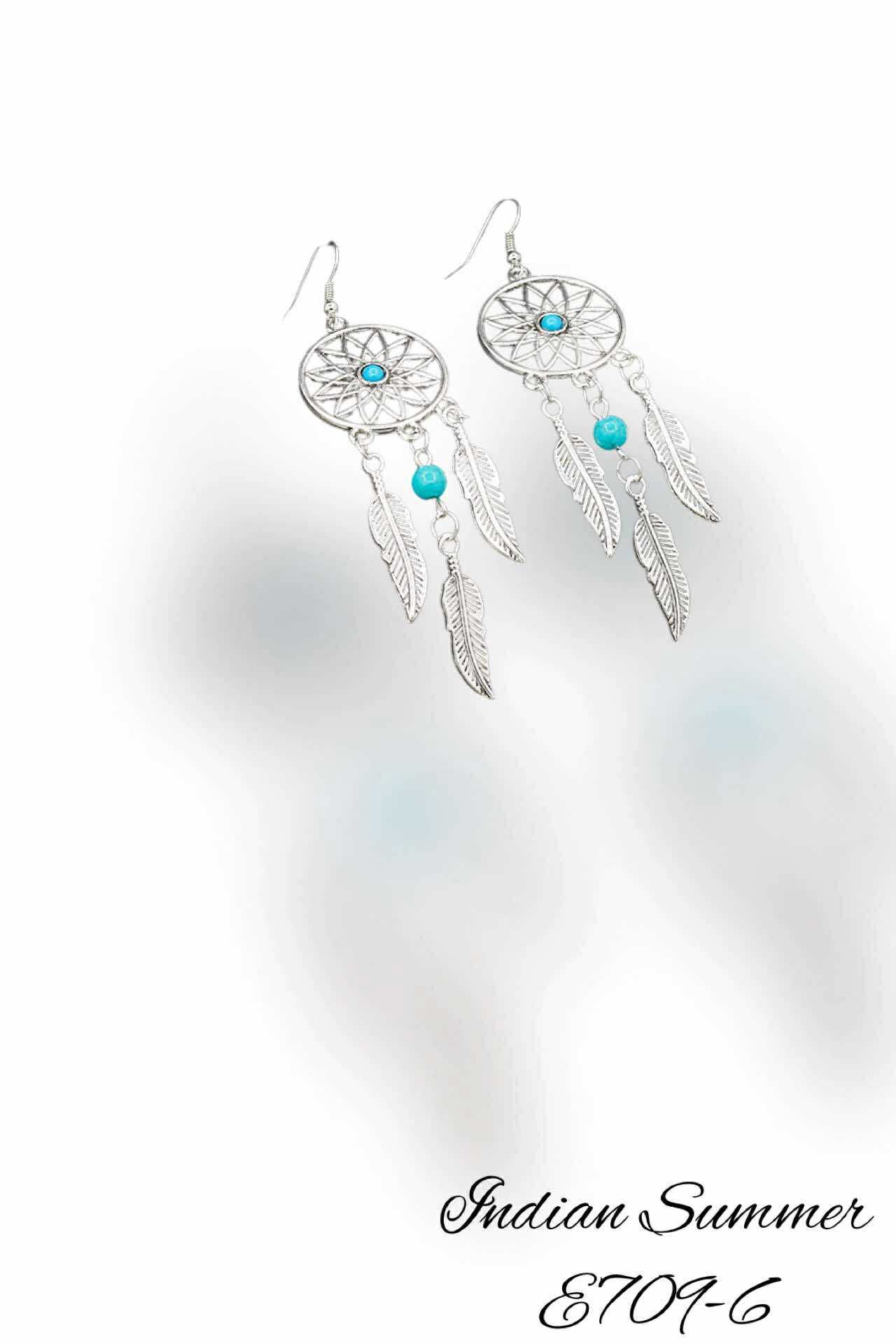These silver fishhook earrings feature an intricate dream catcher design accented with vibrant turquoise stones and beads. Three delicate silver feathers dangle gracefully, adding movement and a touch of Native American-inspired elegance. Perfect for those who appreciate detailed craftsmanship and meaningful accessories.