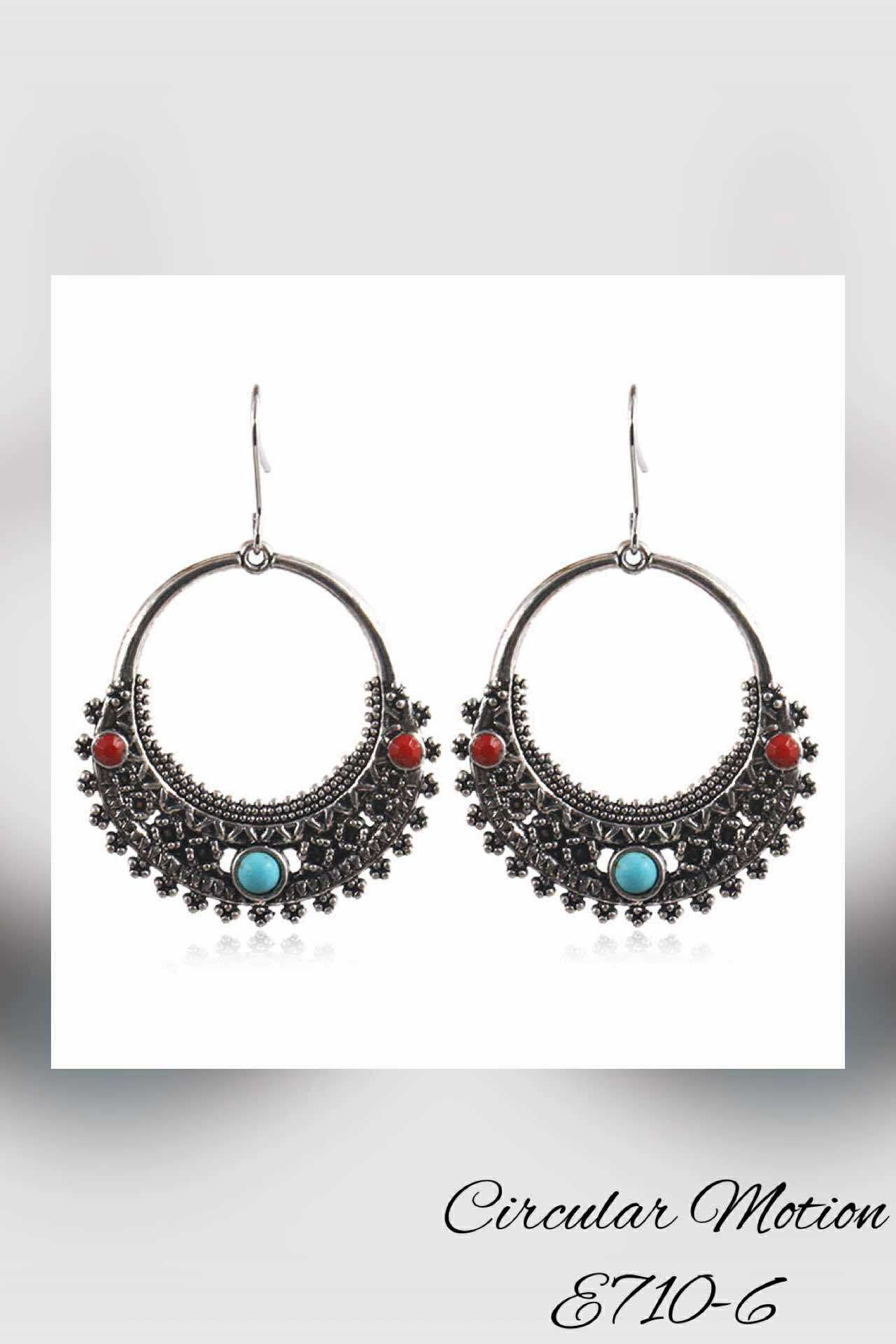 These Bohemian-style round silver fishhook earrings showcase intricate western-inspired artwork, accented with vibrant turquoise and red stones. Their unique design combines traditional craftsmanship with bold color contrasts, making them a distinctive accessory that complements both casual and refined looks. Perfect for those who appreciate artisanal jewelry with a cultural flair.