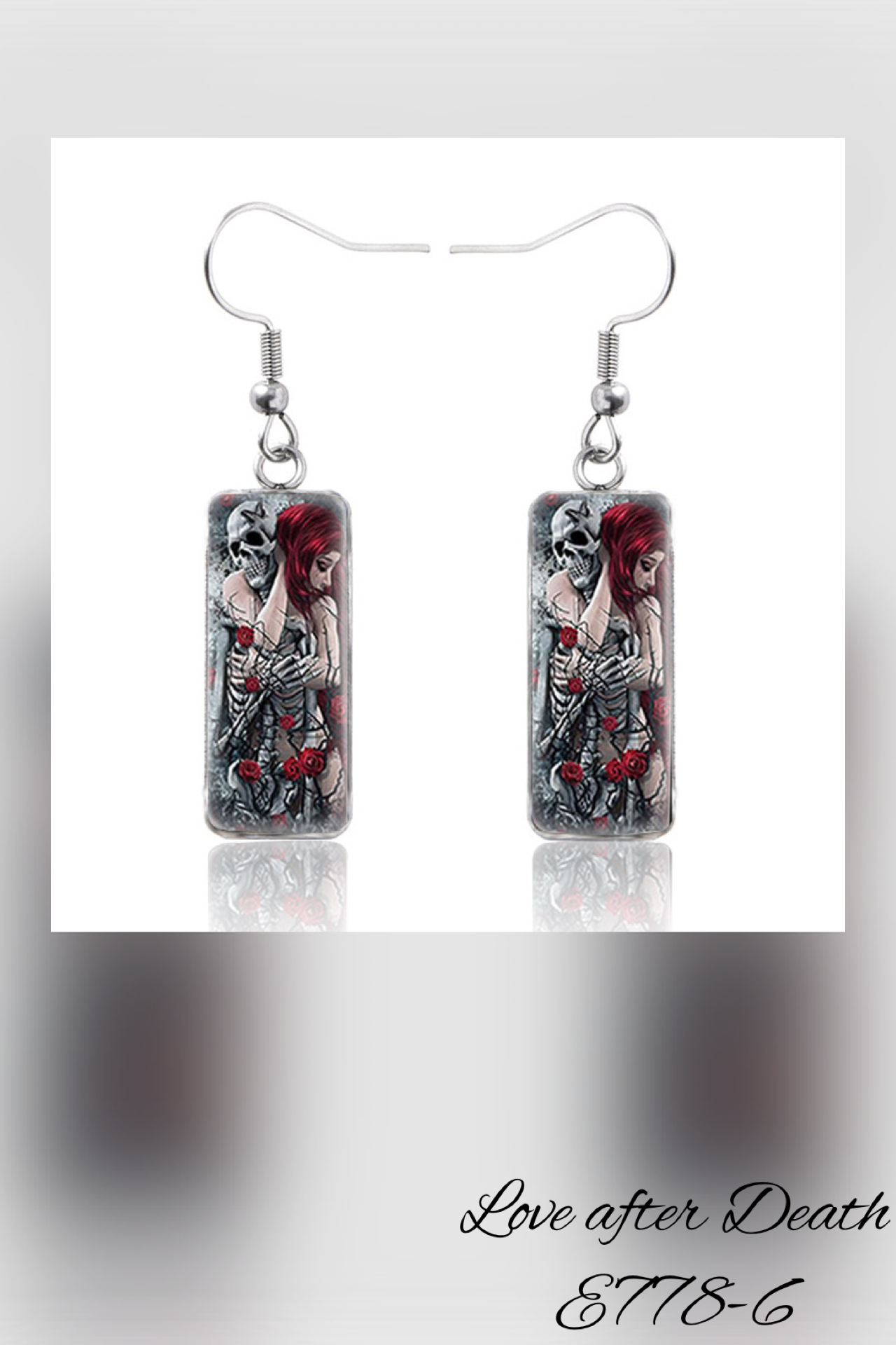 This E778-6 Love after Death necklace features a striking combination of a silverfish hook and a rectangle cabochon. The cabochon is adorned with a skeleton and a woman in an embrace, with red hair and roses adding a touch of romance. Elevate your style with this unique and edgy piece.