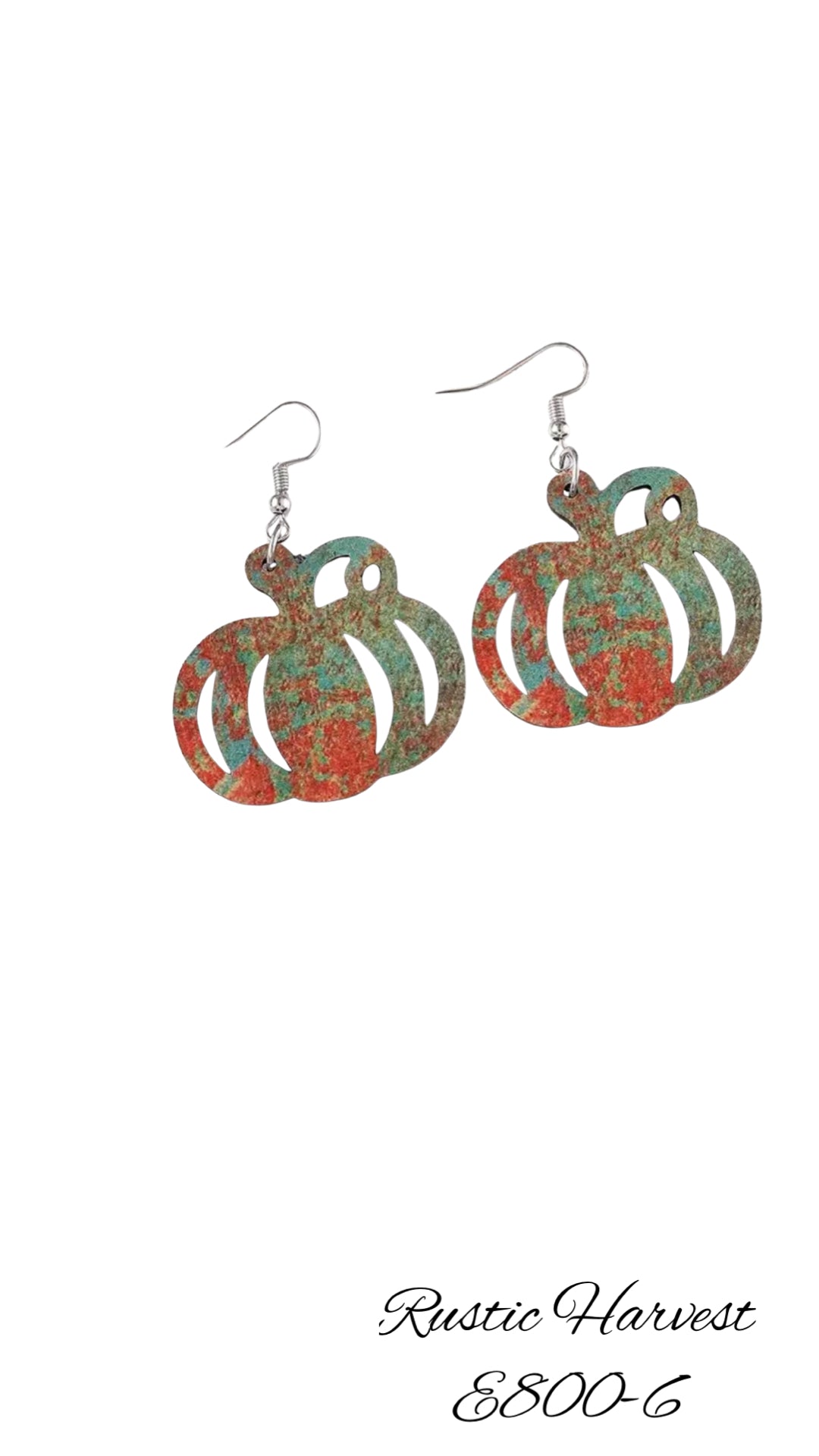 The E800-6 Rustic Harvest features intricately crafted wooden pumpkins adorned with silver fishhook accents. Painted in a striking green and orange splatter pattern, these decorative pieces blend rustic charm with artistic flair. Ideal for seasonal displays, they bring a sophisticated touch to autumn décor through their unique texture and carefully detailed finishes.
