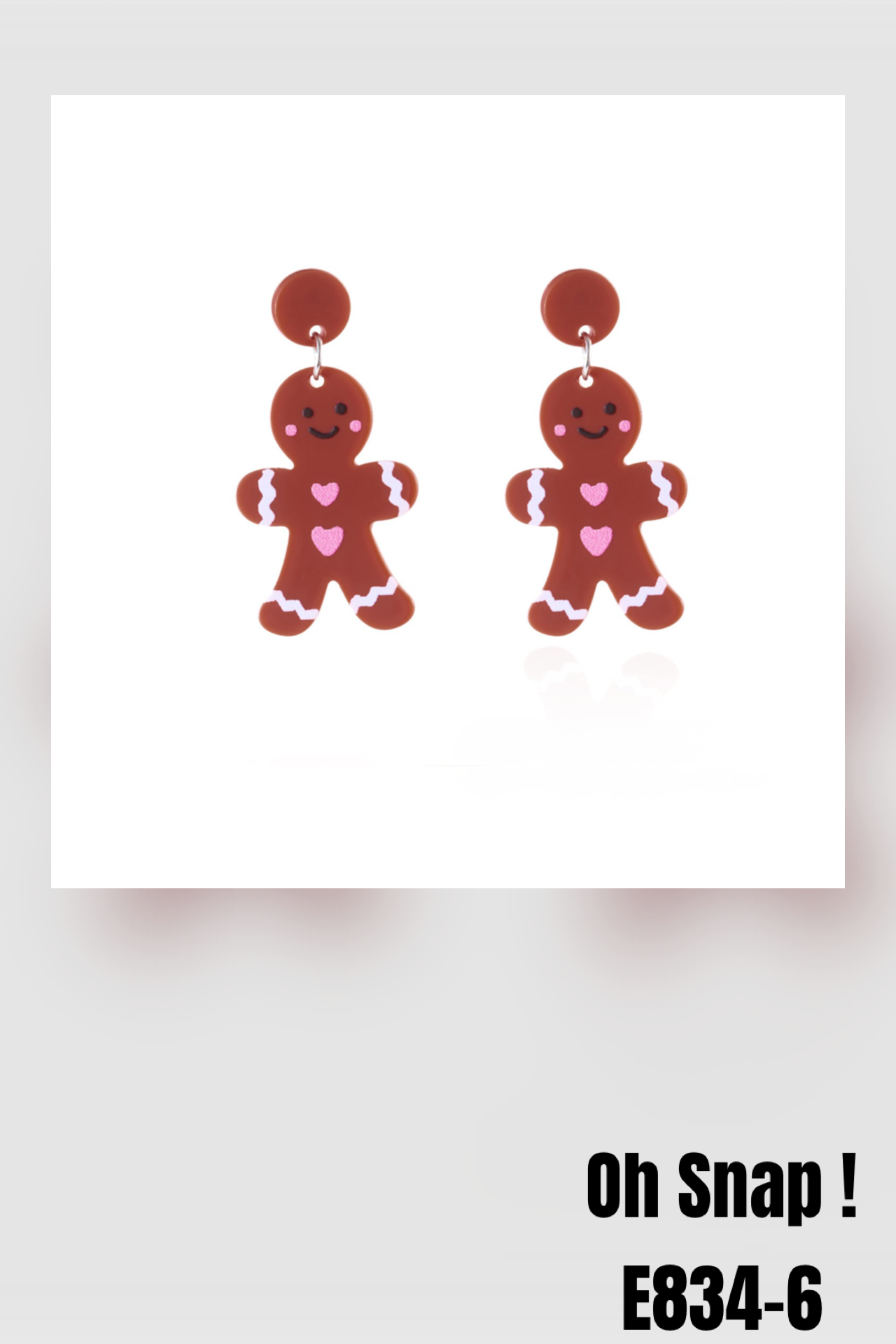 These E834-6 Oh Snap! earrings feature a cute brown gingerbread man with pink hearts and an adorable face, all crafted with durable acrylic materials. With secure post backs, these statement earrings are lightweight and comfortable to wear while adding a touch of whimsy to any outfit.