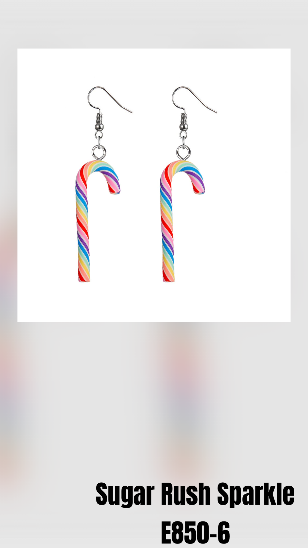 Upgrade your style with our E850-6 Sugar Rush Sparkle earrings. Made with silver fishhooks, soft clay and colorful candy cane stripes, these earrings add a touch of whimsy to any outfit. The perfect accessory for the fashionista in you.