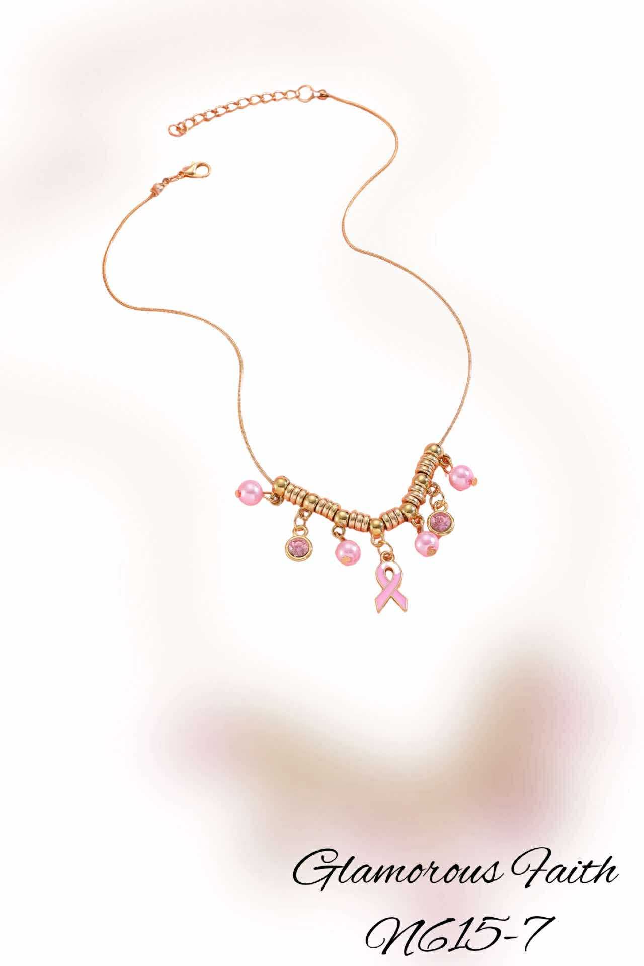 Elevate your style with the N615-7 Glamourous Faith necklace, featuring a 16-inch gold chain complemented by a 2-inch extender for adjustable wear. This expertly crafted piece combines gold beads, delicate pink pearls, and pink gemstones, all accented by a soft pink ribbon. Perfect for adding a refined touch of elegance and subtle color to any outfit.