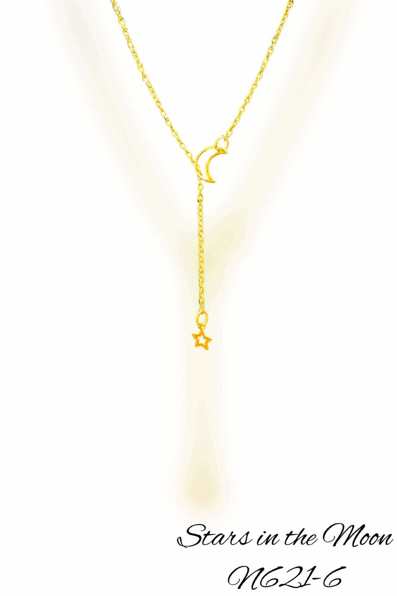 This elegant 25-inch gold necklace features a unique design with a crescent moon on one end and a single star on the other, allowing you to wear the star nestled within the moon. Crafted for subtle sophistication, it offers a delicate yet meaningful accessory that complements any outfit with a celestial touch.