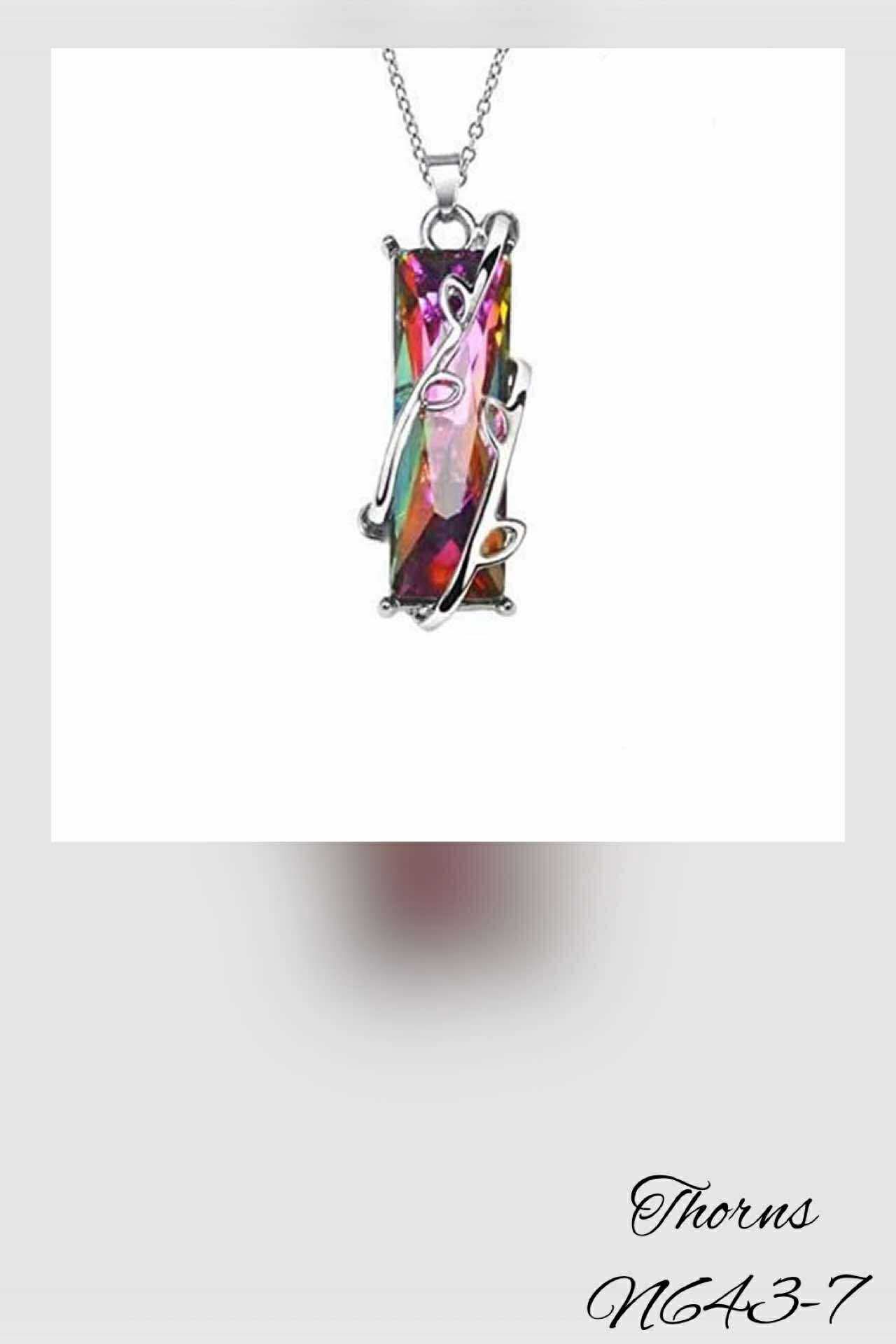 This elegant 18 1/2-inch silver chain features a 2-inch extender for adjustable length, making it versatile for any neckline. The centerpiece is a striking long rectangular stone showcasing a spectrum of colors, securely embraced by intricately crafted silver thorns. This combination of unique design and craftsmanship offers a sophisticated accessory that easily elevates both casual and formal looks.
