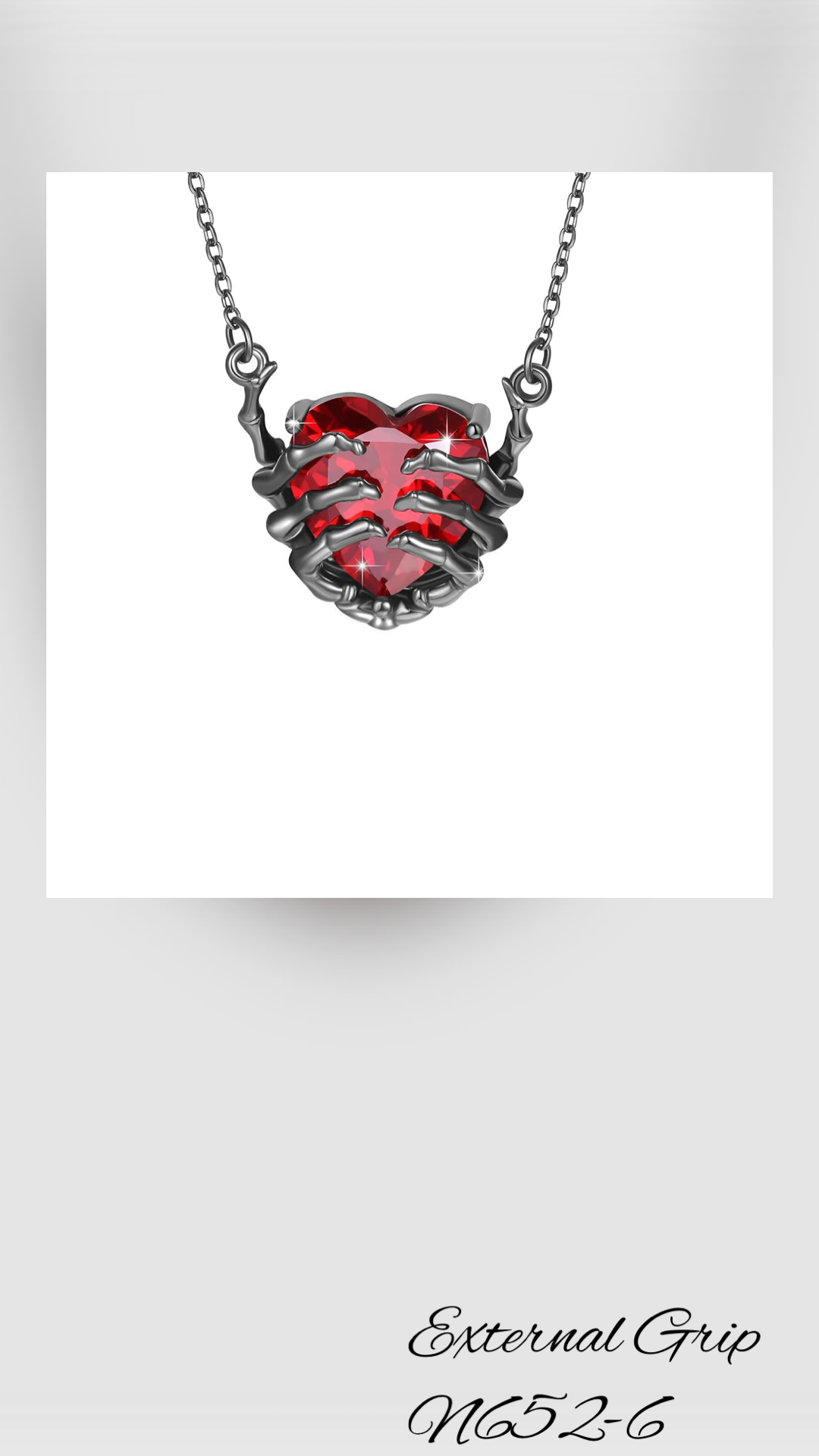 The N652-6 External Grip features exaggerated heart shape alloy black skeleton hands holding a striking red gemstone, adding a touch of boldness to any outfit. The sleek black 21 inch chain, with a 2 inch extender, completes the edgy look. Elevate your style with this unique accessory.