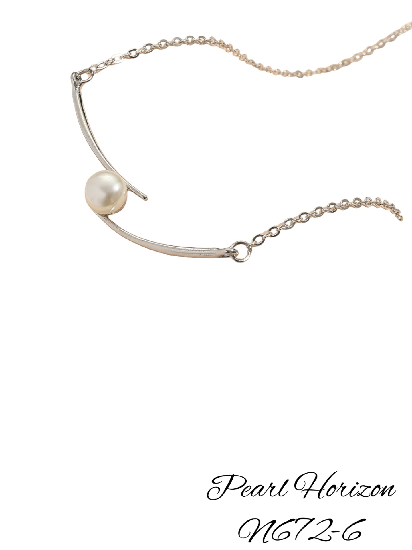 Experience elegance with the N672-6 Pearl Horizon necklace. This stunning piece features a silver 18 1/2 inch chain, complete with a 3 inch extender for the perfect fit. Two silver bars are delicately connected by a magnificent white pearl, creating a timeless and sophisticated look.