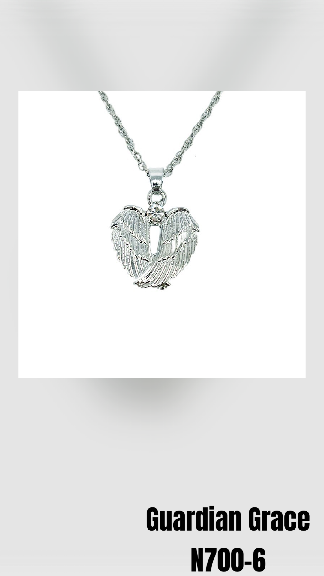 The N700-6 Guardian Grace features an 18 1/2-inch silver chain with a 2-inch extension and angel wings adorned with a sparkling gemstone. Elevate any outfit with this elegant and symbolic accessory.