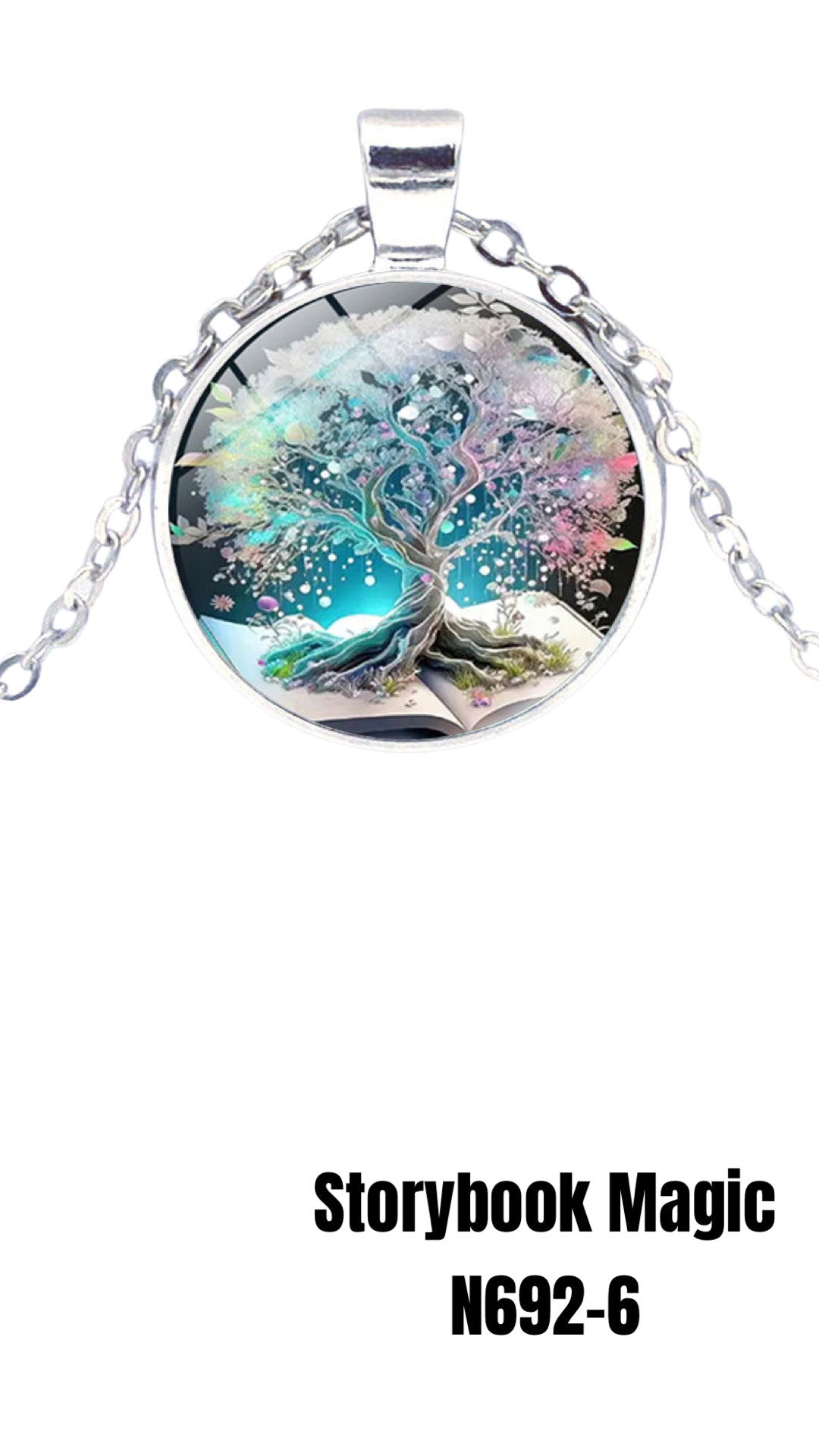 Experience the magic of the holidays with N692-6 Storybook Magic. Featuring a snowy tree scene, this pendant necklace comes with a 23-inch silver chain. Add a touch of enchantment to any outfit and embrace the festive season.