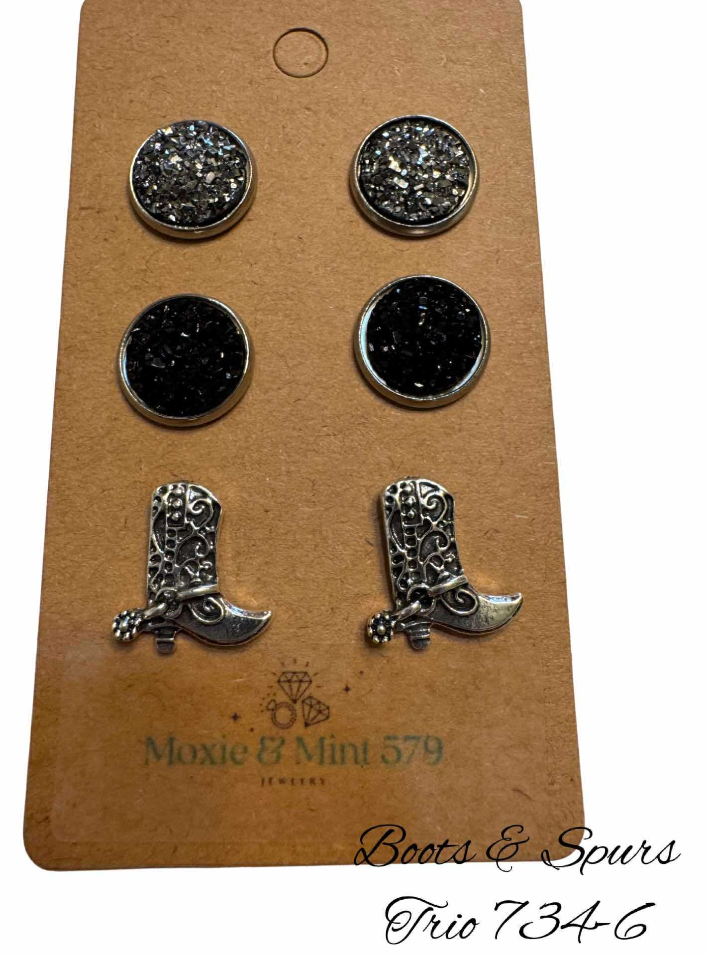 This exclusive Trio 734-6 collection features three distinct sets of post-back earrings: shimmering silver druzy, striking black druzy, and intricately detailed silver cowboy boots with spurs. Each pair combines expert craftsmanship with unique design elements, offering versatile options to elevate your style with a touch of rugged elegance and sparkling sophistication. Perfect for those who appreciate finely made accessories that stand out with subtle yet impactful charm.