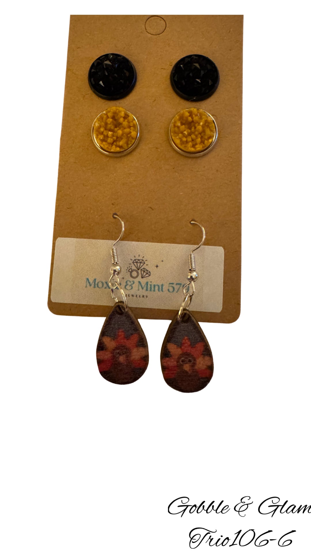Experience versatile elegance with the Trio106-6 Gobble & Glam set, featuring three pairs of earrings designed to complement any style. The collection includes striking black drusy post-back earrings, vibrant silver and mustard drusy pairs, and a charming silver fishhook with a wooden mini turkey detail. Each piece combines unique textures and colors to elevate your look with subtle sophistication, perfect for both everyday wear and special occasions.